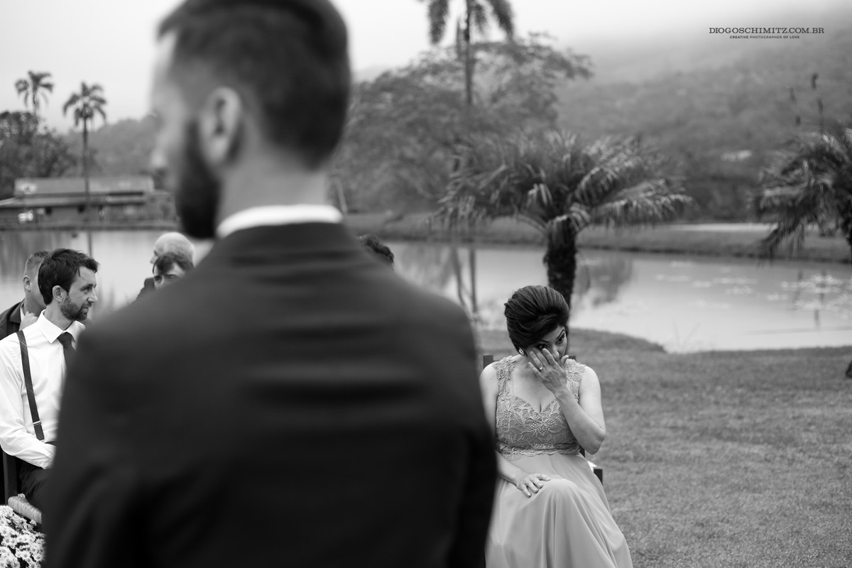 Reação da mãe do noivo ao ver seu filho na cerimônia de casamento no campo.